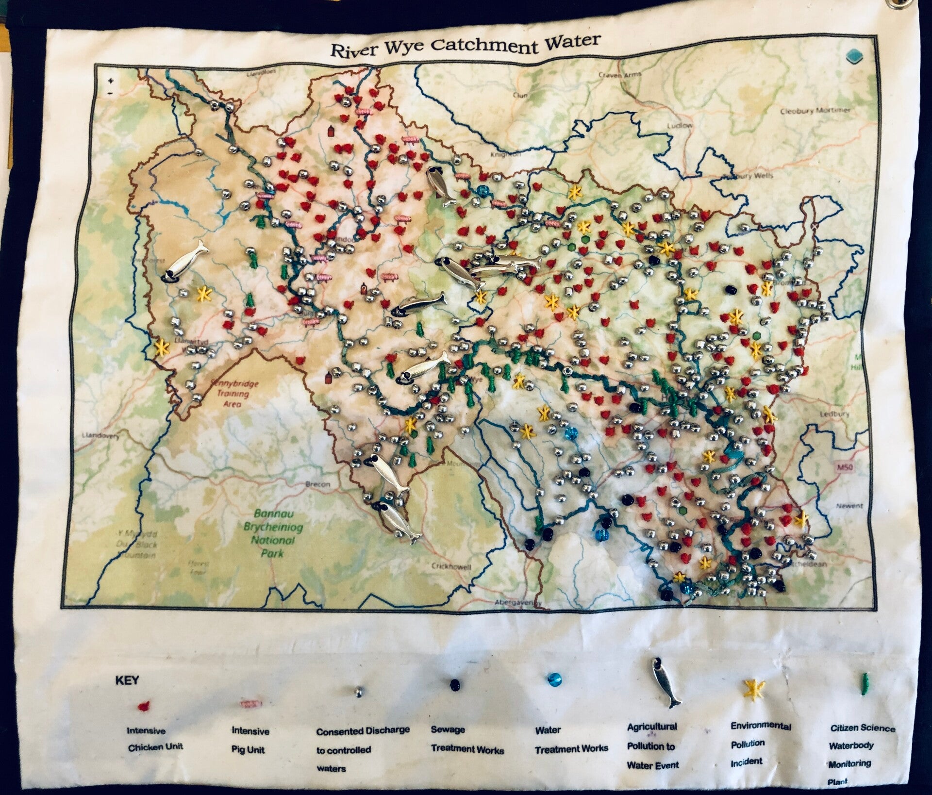WYE? A large upcycled roof slate showing the course of the River Wye is inlaid with copper.. Chicken wish bones, symbolising the many chicken farms situated in the Wye catchment area are mounted onto the slate eerily looking like hunting trophies as were displayed in great halls and stately homes in the past. These are hung with enamelled fish skeletons, weighted by lead weights so highlighting the scale of pollution within our rivers and illustrating why they are suffering and the state of the river’s food chain.. However hope is not lost as the wishbones symbolise.
