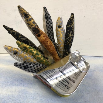 Fabric fish created from scraps and hand dyed and printed fabrics. Jumping out of an old cast iron kettle, escaping the condition of the water!